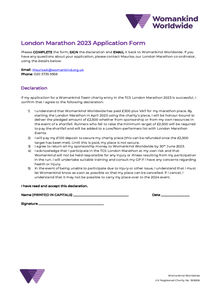 London Marathon 2023 Application Form Please COMPLETE the form, SIGN the declaration and EMAIL it back to Womankind Worldwide. If you have any questions about your application, please contact Marisa,