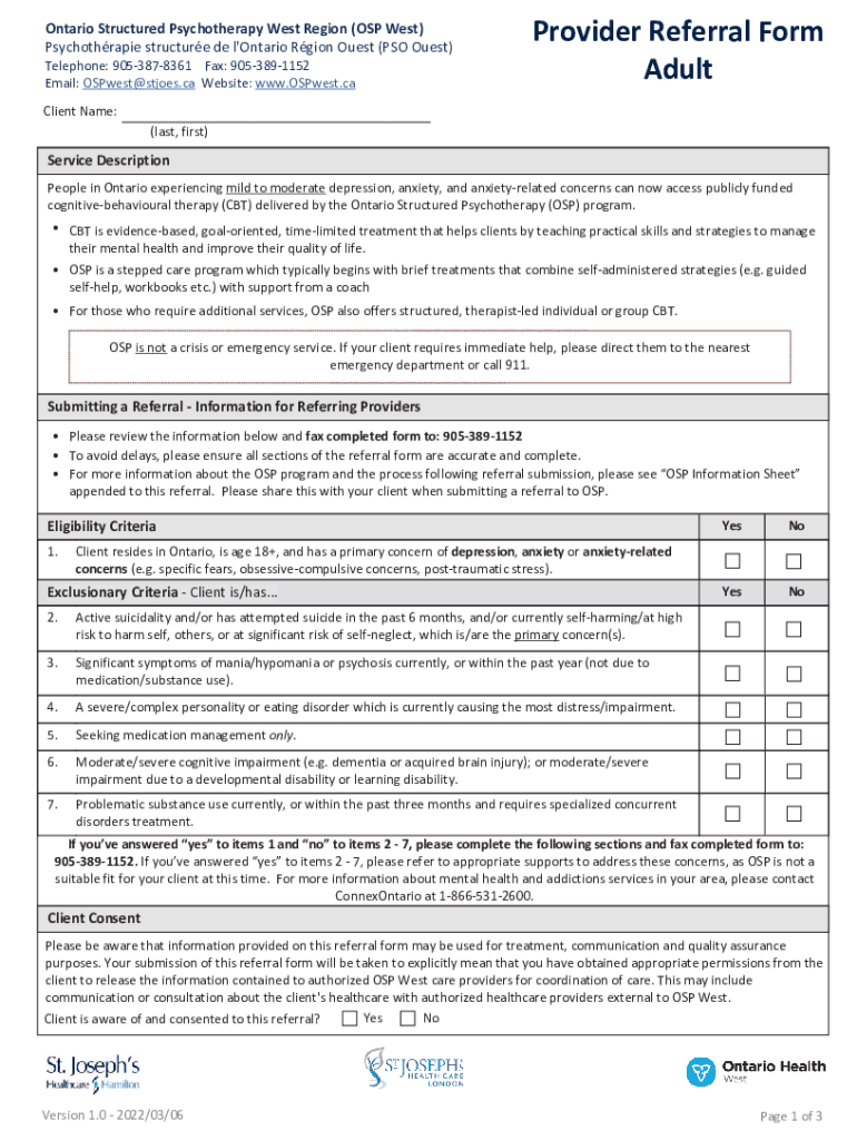 Ontario Structured Psychotherapy West Region (DSP West) Psychotherapies structure de l\'Ontario Region Guest (PSO Guest) Telephone: 9053878361 Fax: 9053891152 Email: OSPwest@stjoes.ca Website: www.OSPwest.caProvider
