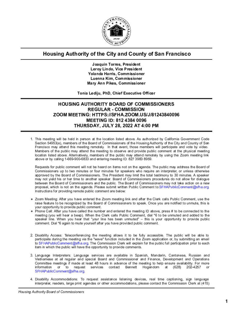 Housing Authority of the City and County of San Francisco Joaquin Torres, President Leroy Linda, Vice President Yolanda Harris, Commissioner Duenna Kim, Commissioner Mary Ann Pikes, Commissioner Tonia