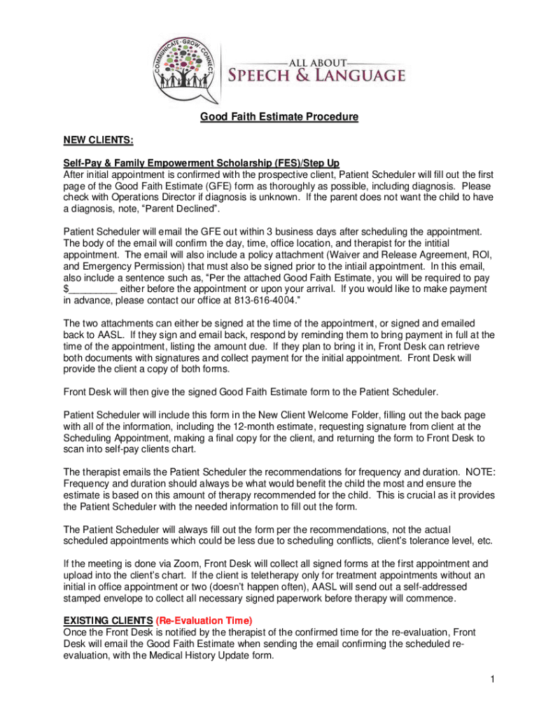 Good Faith Estimate Procedure NEW CLIENTS: Self & Family Empowerment Scholarship (FES)/Step Up After initial appointment is confirmed with the prospective client, Patient Scheduler will fill out the