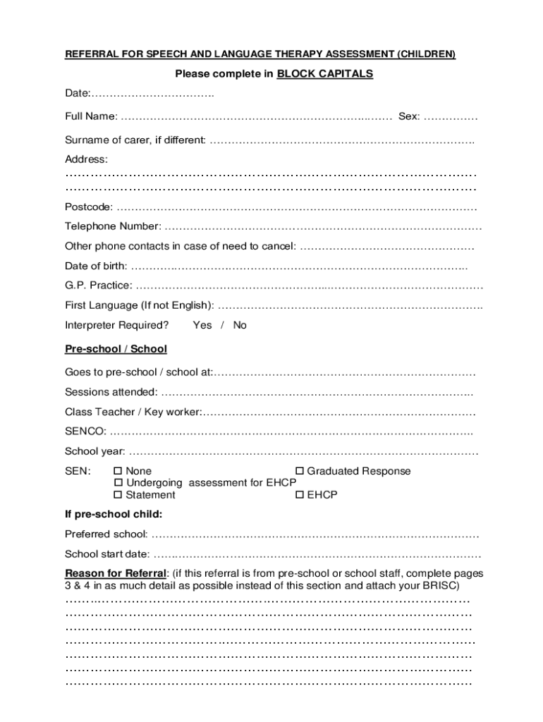 REFERRAL FOR SPEECH AND LANGUAGE THERAPY ASSESSMENT (CHILDREN)Please complete in BLOCK CAPITALS Date:. Full Name: ... Sex: Surname of carer, if different:. Address:.