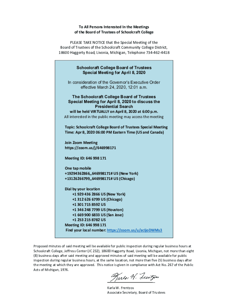 To All Persons Interested In the Meetings of the Board of Trustees of School craft College PLEASE TAKE NOTICE that the Special Meeting of the Board of Trustees of the School craft Community College
