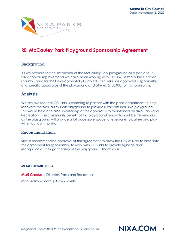 Memo to City Council Date: November 2, 2022RE: McCauley Park Playground Sponsorship Agreement Background: As we prepare for the installation of the McCauley Park playground as a part of our 2022 capital