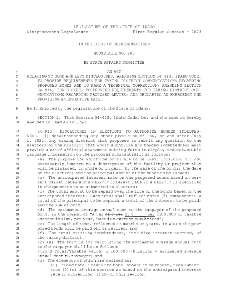 Get the free HOUSE BILL NO.286 (2023) - Bond, levy communications - legislature idaho