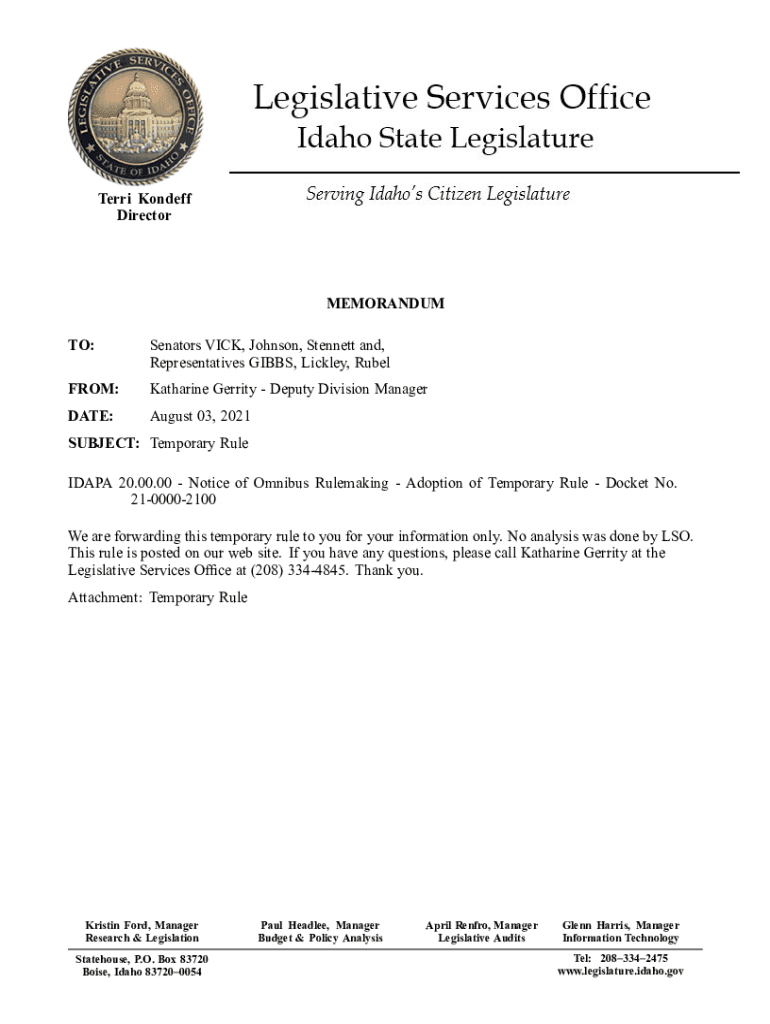 Get the free Notice of Omnibus Rulemaking - Adoption of Temporary Rule - legislature idaho