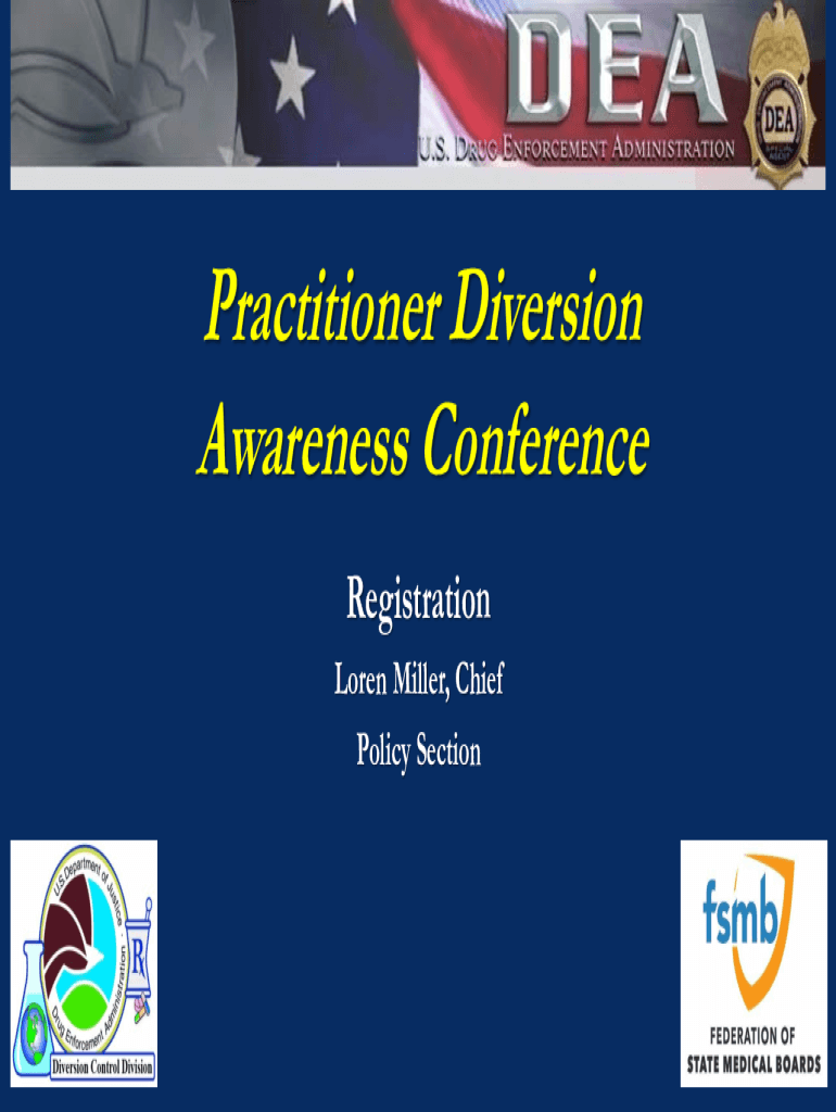 Practitioner Diversion Awareness Conference Registration Loren Miller, Chief Policy Sectional DISCLAIMER The following presentation was accompanied by an oral presentation on November 4 & 5, 2019,