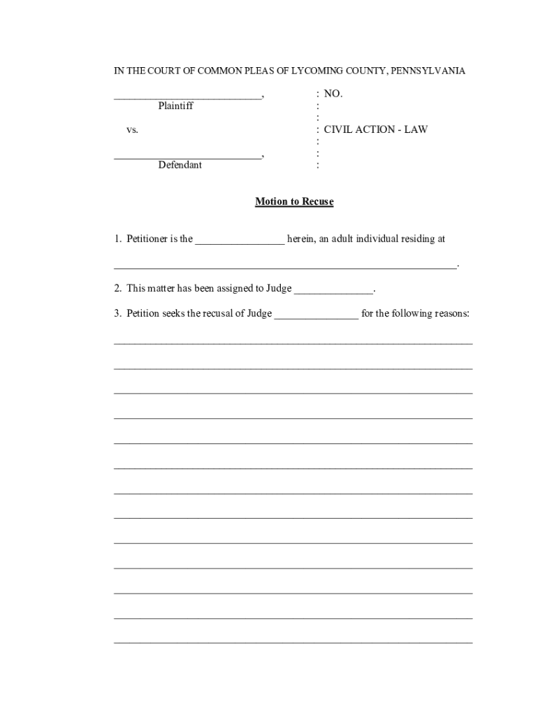 IN THE COURT OF COMMON PLEAS OF LYCOMING COUNTY, PENNSYLVANIA___, Plaintiff vs. ___, Defendant: NO. : : : CIVIL ACTION LAW : : :Motion to Recuse 1. Petitioner is the ___ herein, an adult individual
