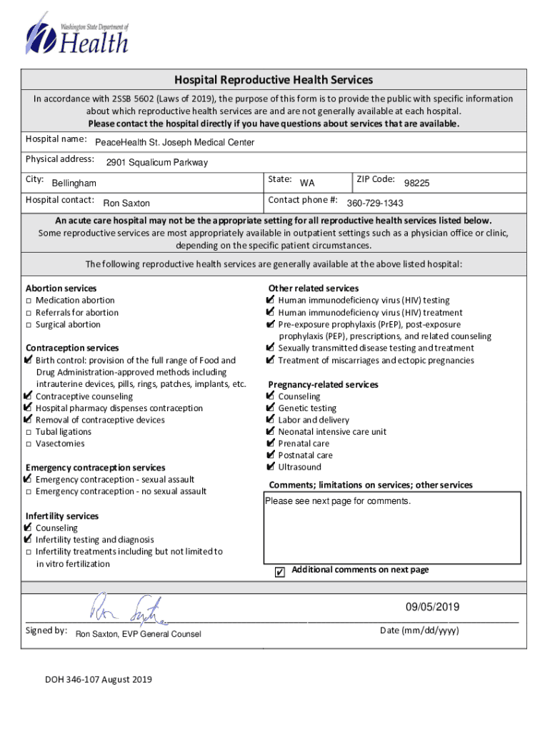 Hospital Reproductive Health Services In accordance with 2SSB 5602 (Laws of 2019), the purpose of this form is to provide the public with specific information about which reproductive health services