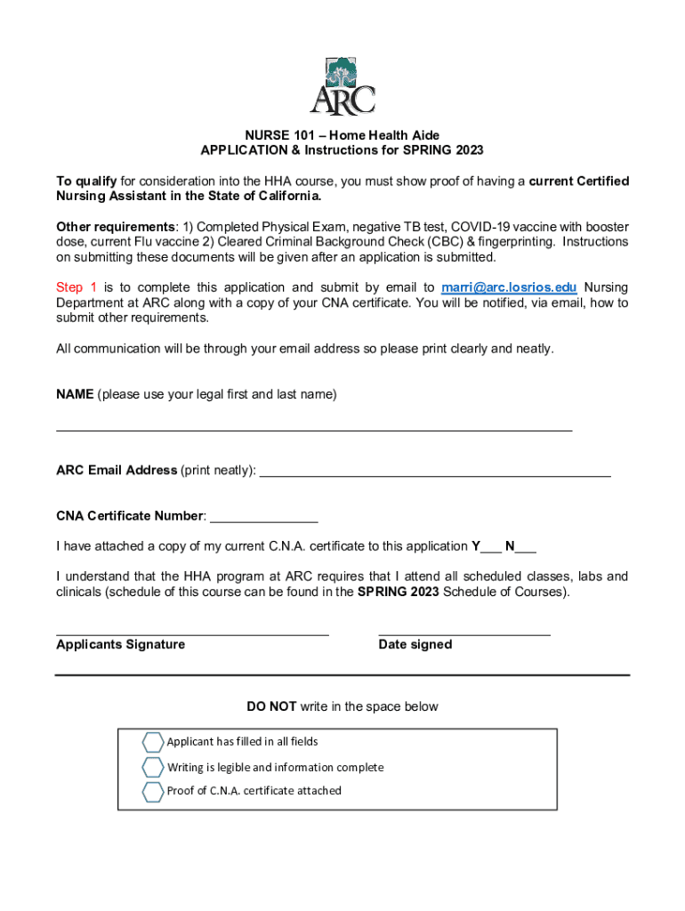 NURSE 101 Home Health Aide APPLICATION & Instructions for SPRING 2023 To qualify for consideration into the HHA course, you must show proof of having a current Certified Nursing Assistant in the State