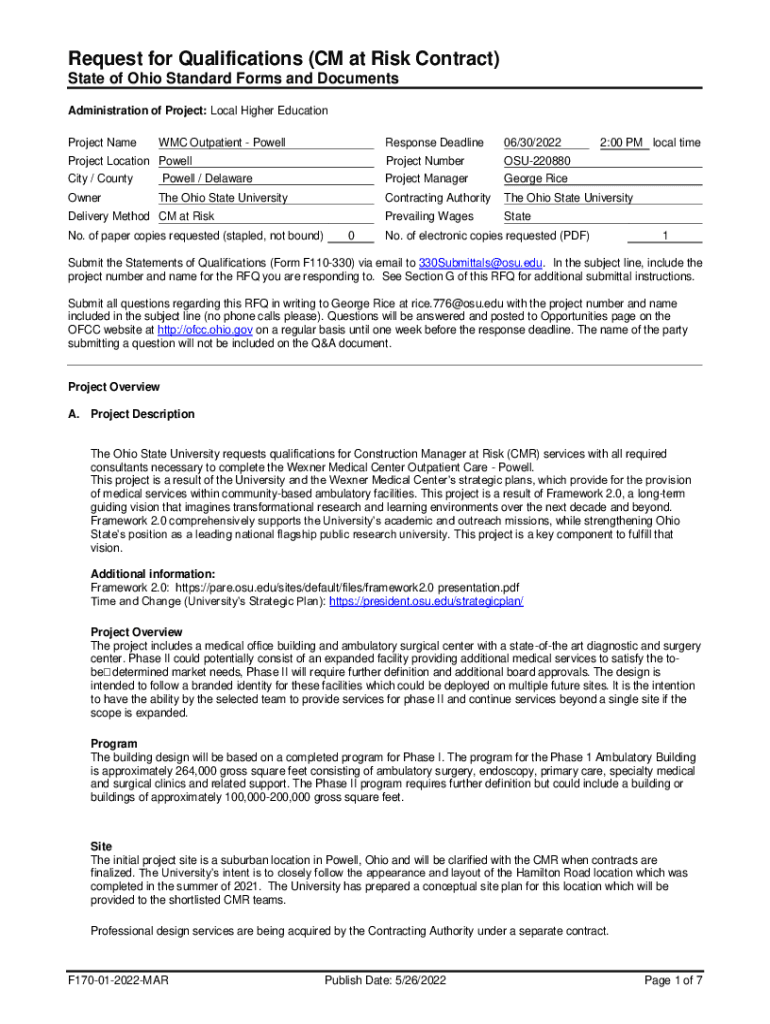 Request for Qualifications (CM at Risk Contract) State of Ohio Standard Forms and Documents Administration of Project: Local Higher Education Project Non-response Deadline06/30/2022Project Location