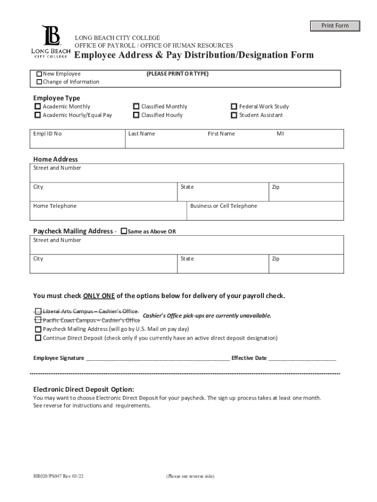 OFFICE OF PAYROLL / OFFICE OF HUMAN RESOURCESEmployee Address & Pay Distribution/Designation Form