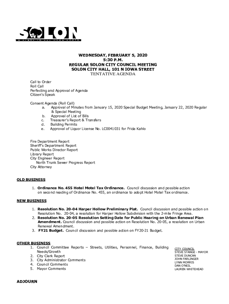 WEDNESDAY, FEBRUARY 5, 2020 5:30 P.M. REGULAR SOLON CITY COUNCIL MEETING SOLON CITY HALL, 101 N IOWA STREETTENTATIVE AGENDA Call to Order Roll Call Perfecting and Approval of Agenda Citizens Speak