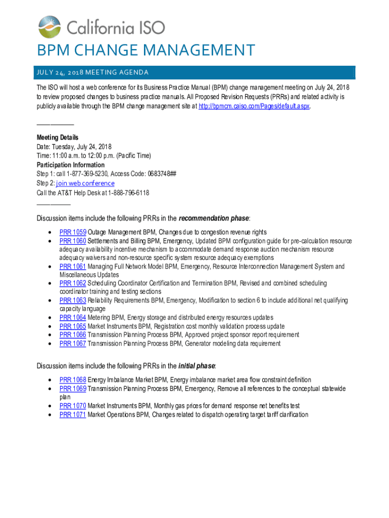 BPM CHANGE MANAGEMENT JULY 24, 2018, MEETING AGENDA The ISO will host a web conference for its Business Practice Manual (BPM) change management meeting on July 24, 2018, to review proposed changes