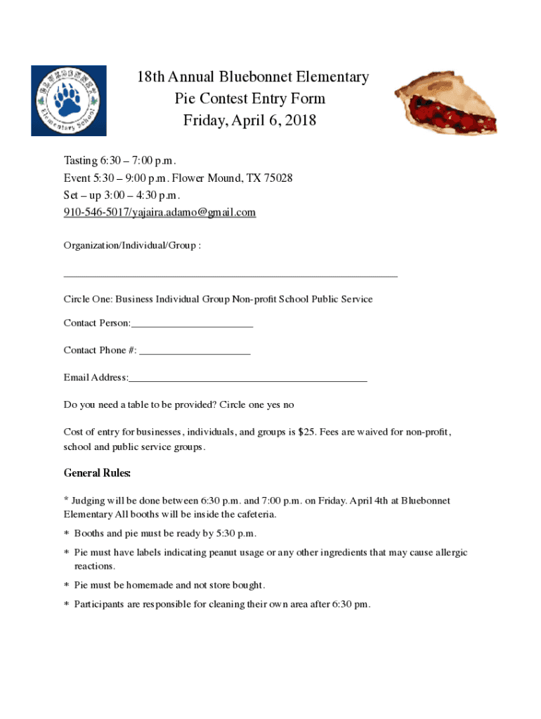 Get the free 18th Annual Bluebonnet Elementary Pie Contest Entry Form Friday ...