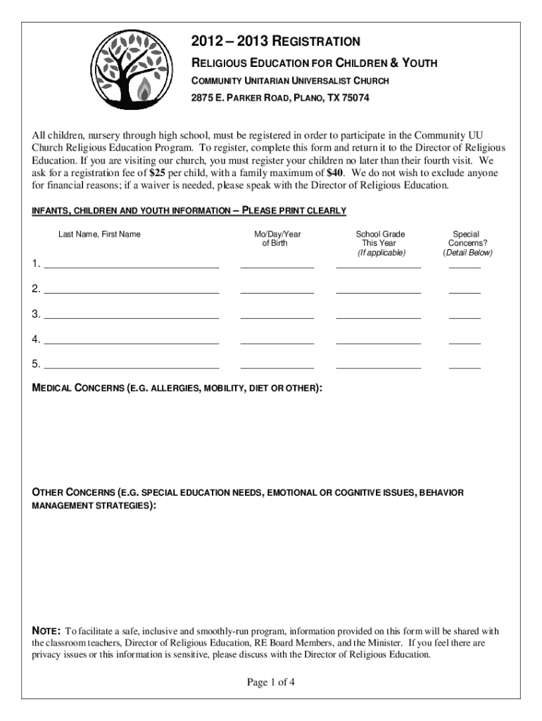 2012 2013 REGISTRATION RELIGIOUS EDUCATION FOR CHILDREN & YOUTH COMMUNITY UNITARIAN UNIVERSALIST CHURCH 2875 E. PARKER ROAD, PLANO, TX 75074All children, nursery through high school, must be registered