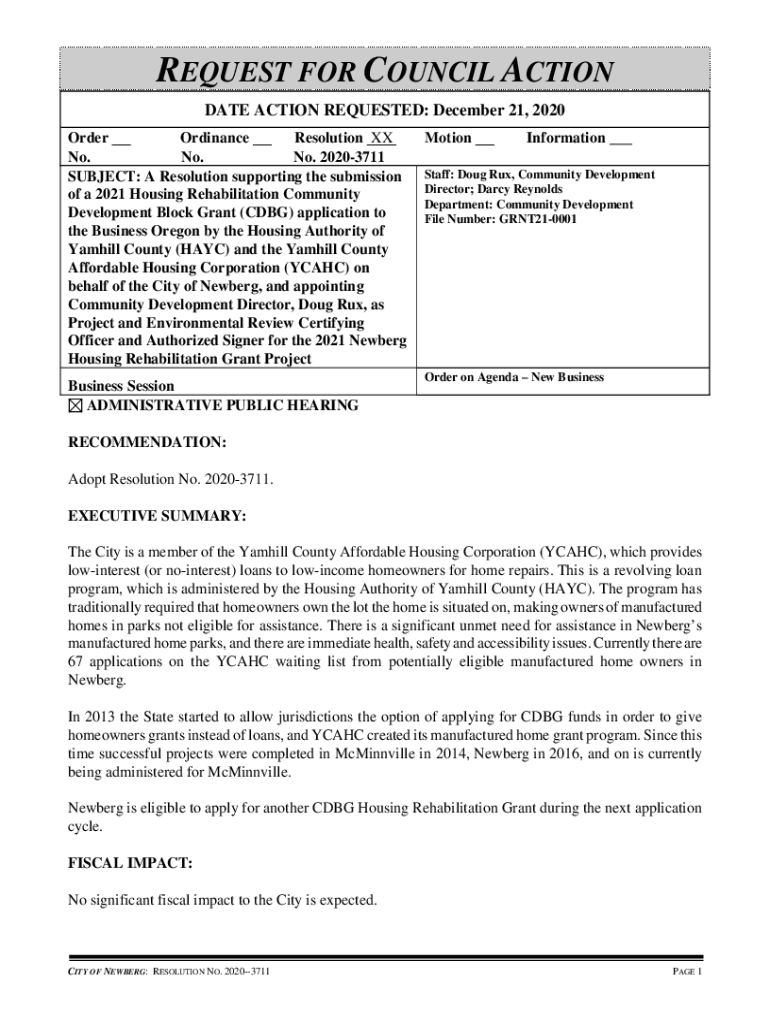 REQUEST FOR COUNCIL ACTION DATE ACTION REQUESTED: December 21, 2020, Order Ordinance Resolution XX No. No. No. 20203711 SUBJECT: A Resolution supporting the submission of a 2021 Housing Rehabilitation