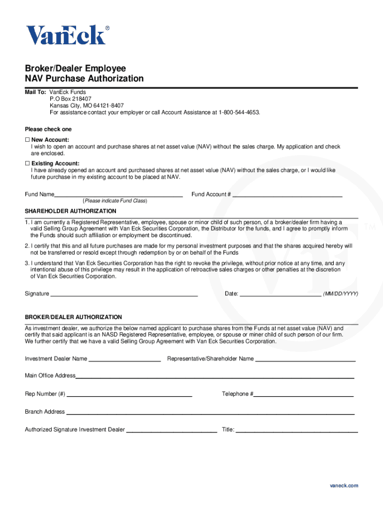 Broker/Dealer Employee NAV Purchase Authorization Mail To: Vane ck Funds P. O Box 218407 Kansas City, MO 641218407 For assistance contact your employer or call Account Assistance at 18005444653. Please