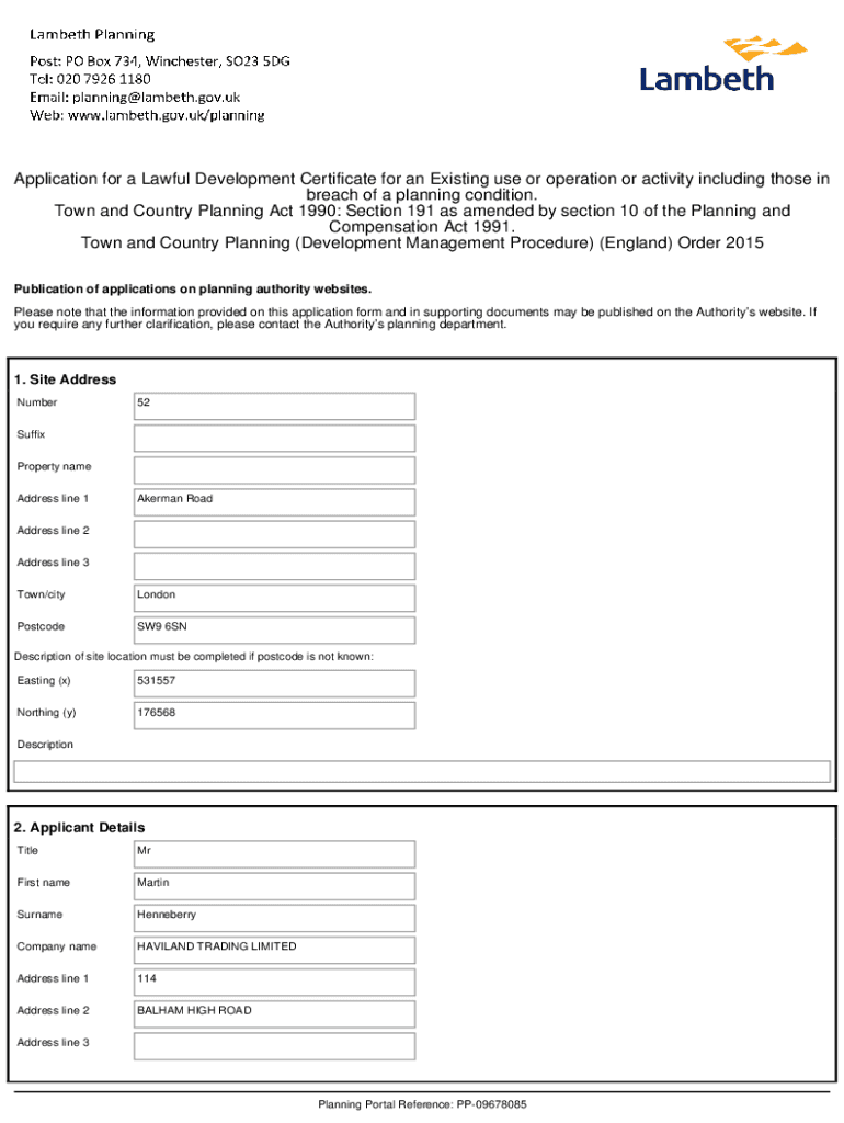 Application for a Lawful Development Certificate for an Existing use or operation or activity including those in breach of a planning condition. Town and Country Planning Act 1990: Section 191 as