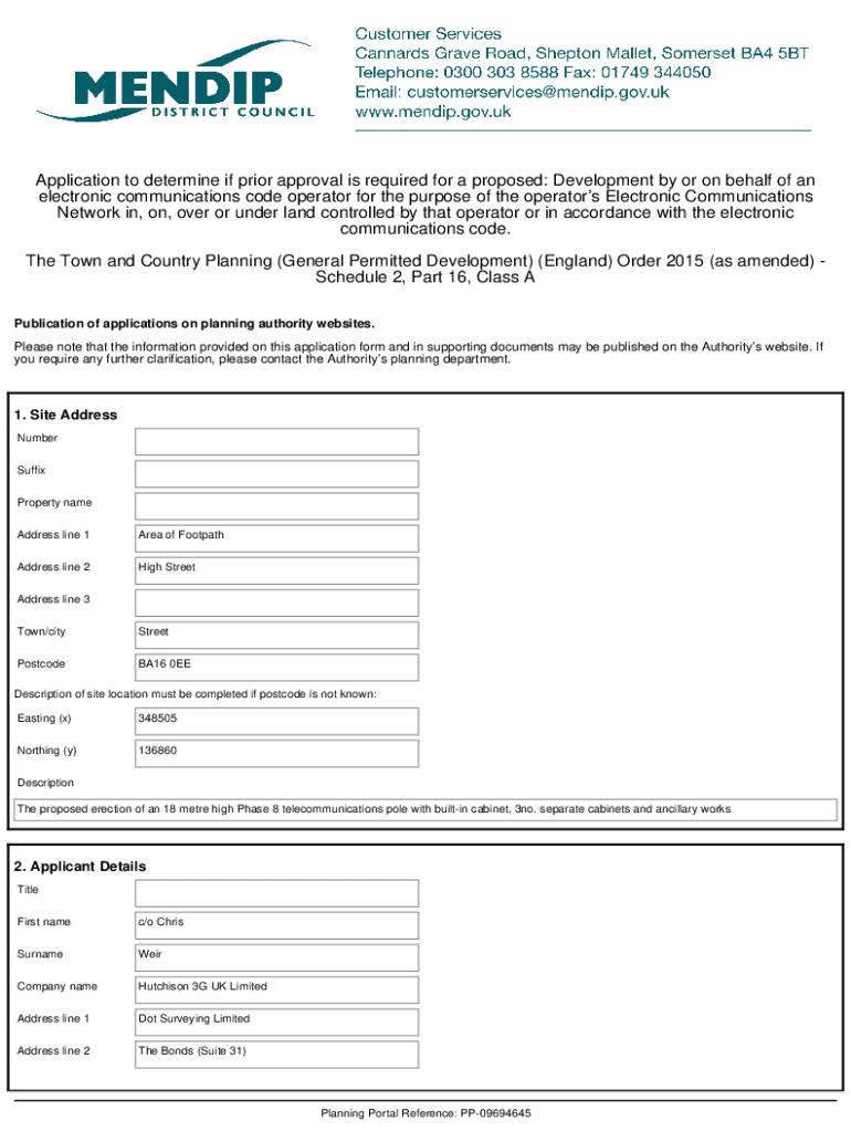 Application to determine if prior approval is required for a proposed: Development by or on behalf of an electronic communications code operator for the purpose of the operators Electronic Communications