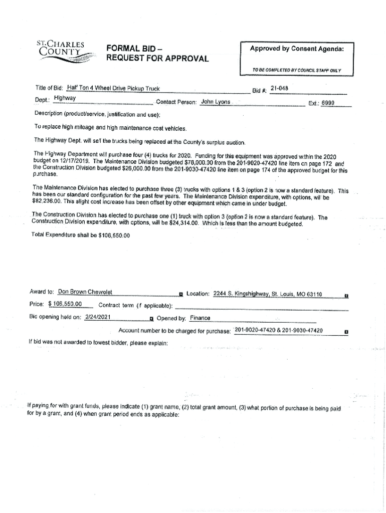 LEGAL NOTICE INVITATION FOR FORMAL BID IF 21048For Half Ton 4-Wheel Drive Pickup Trucks For ST. CHARLES COUNTY GOVERNMENT ST. CHARLES, Missouri. Charles County is seeking bids for four (4) Half Ton
