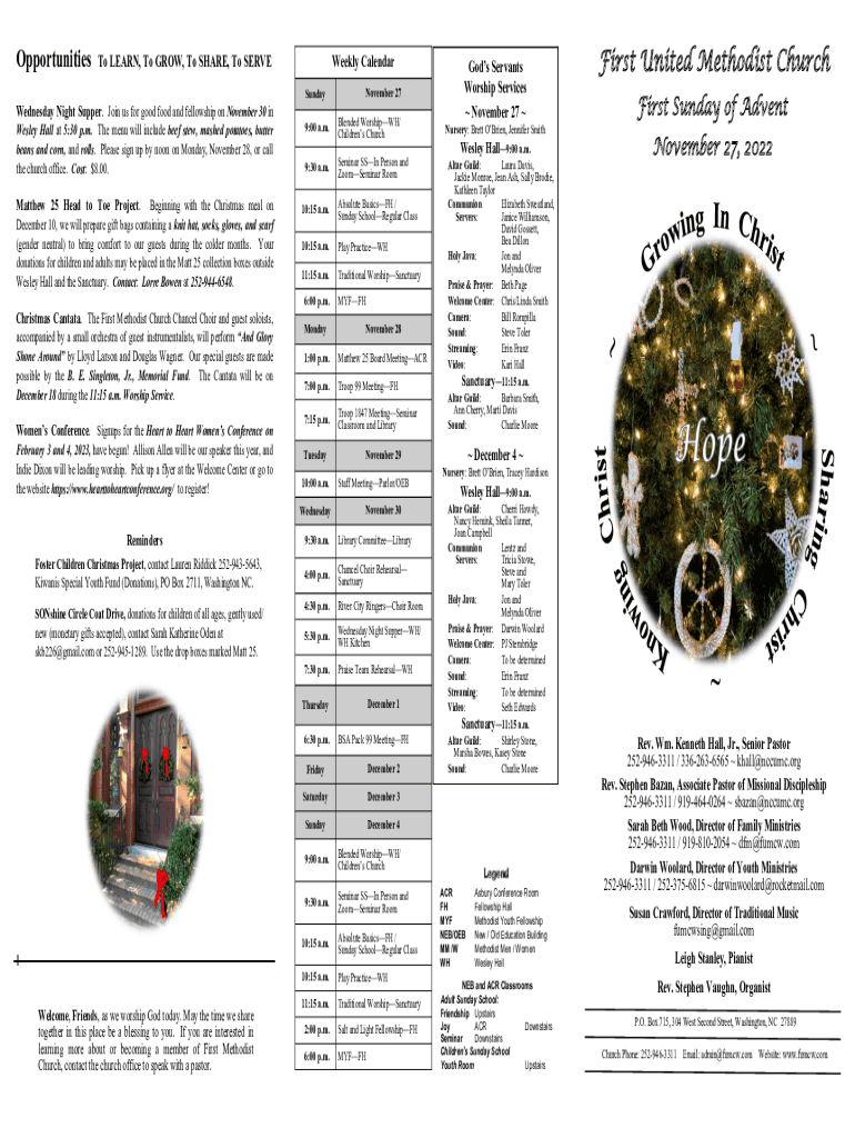 OpportunitiesWeekly Calendar LEARN, To GROW, To SHARE, To SERVE Sunday Wednesday Night Supper. Join us for good food and fellowship on November 30 in Wesley Hall at 5:30 p.m. The menu will include