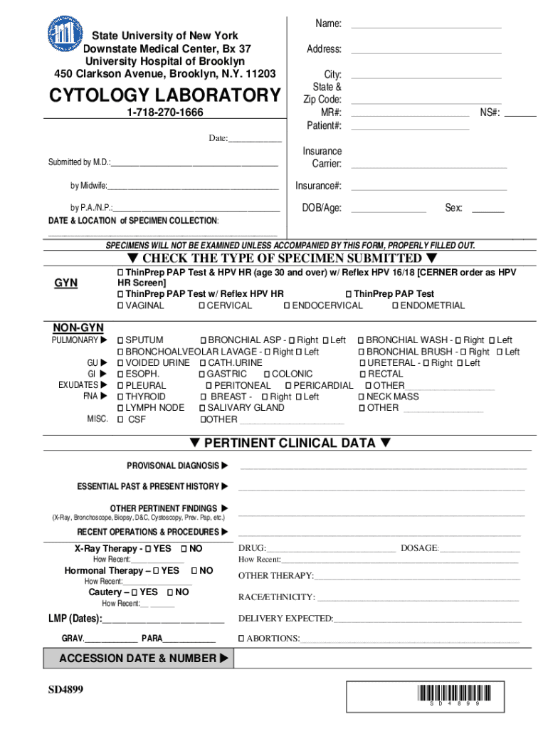 The sd4899 cytology lab formdoc must include details of the cytology lab results, such as patient information, sample collection date, test results, and any additional notes.