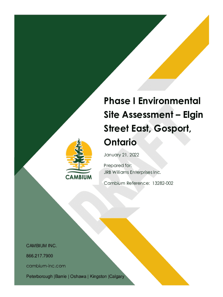Phase I Environmental Site Assessment Elgin Street East, Gosport, Ontario January 21, 2022, Prepared for: JOB Williams Enterprises Inc. Cambium Reference: 13282002CAMBIUM INC. 866.217.7900 cambiuminc.com