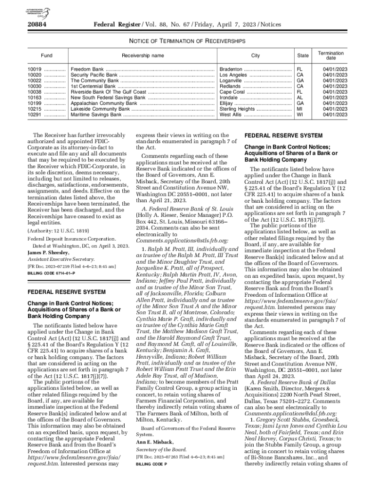 20884Federal Register / Vol. 88, No. 67 / Friday, April 7, 2023 / Notices NOTICE OF TERMINATION OF RECEIVERSHIPSFund 10019 10020 10022 10030 10038 10163 10199 10215 10291................ ................