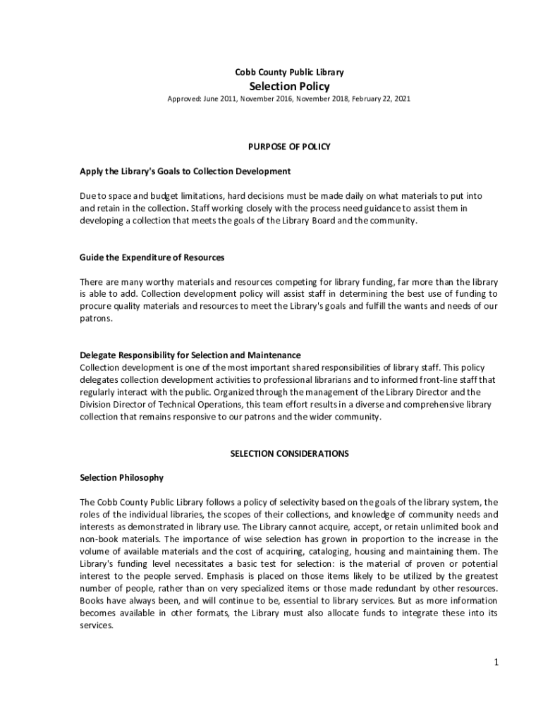 Cobb County Public LibrarySelection PolicyApproved: June 2011, November 2016, November 2018, February 22, 2021PURPOSE OF POLICY Apply the Library\'s Goals to Collection Development Due to space and