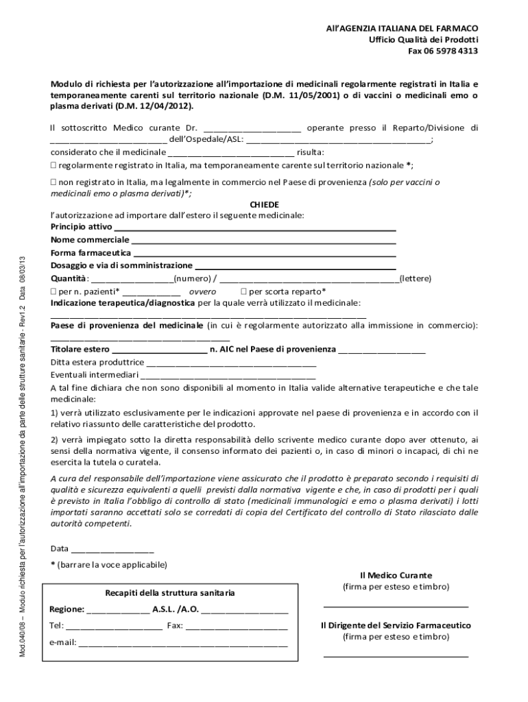 AllAGENZIAITALIANADELFARMACO UfficioQualitdeiProdotti Fax0659784313 ModulodirichiestaperlautorizzazioneallimportazionedimedicinaliregolarmenteregistratiinItaliae temporaneamente parents sub territory