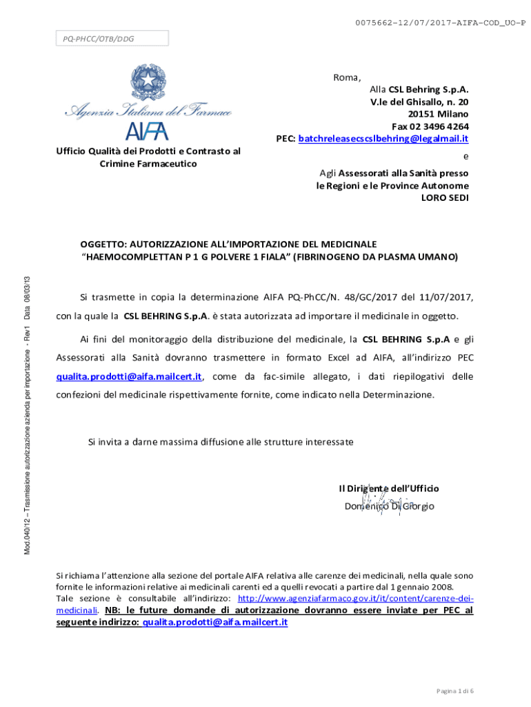 Ottieni il gratuito OGGETTO: AUTORIZZAZIONE ALLIMPORTAZIONE DEL MEDICINALE