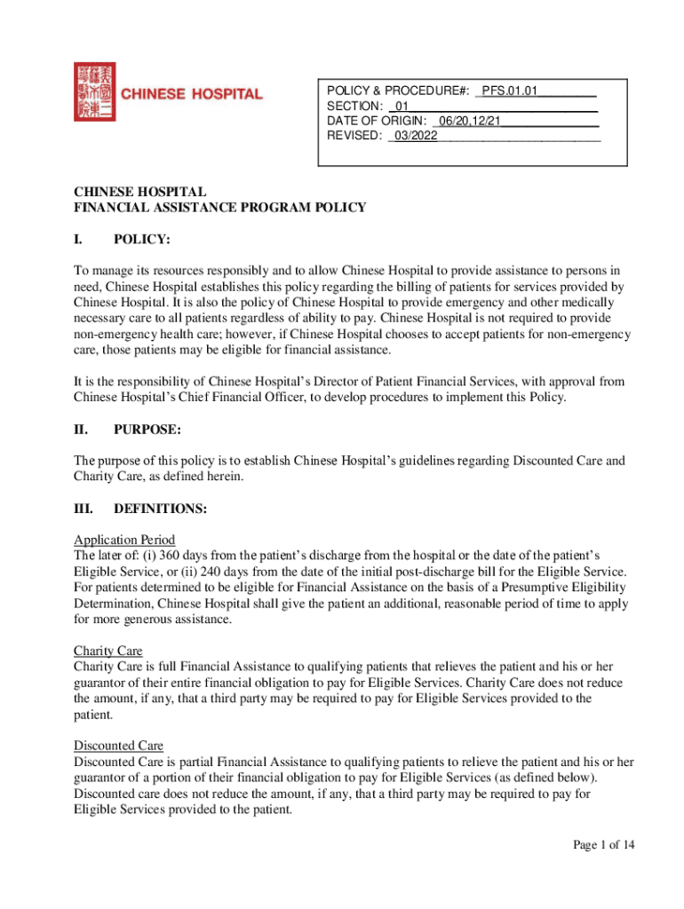 Get the free Chinese Hospital Financial Assistance Program Policy
