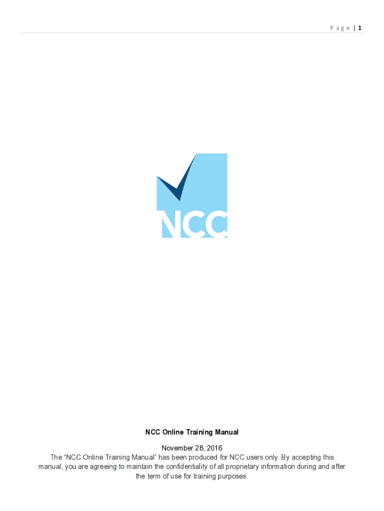 P a g e|1NCC Online Training Manual November 28, 2016, The NCC Online Training Manual has been produced for NCC users only. By accepting this manual, you are agreeing to maintain the confidentiality