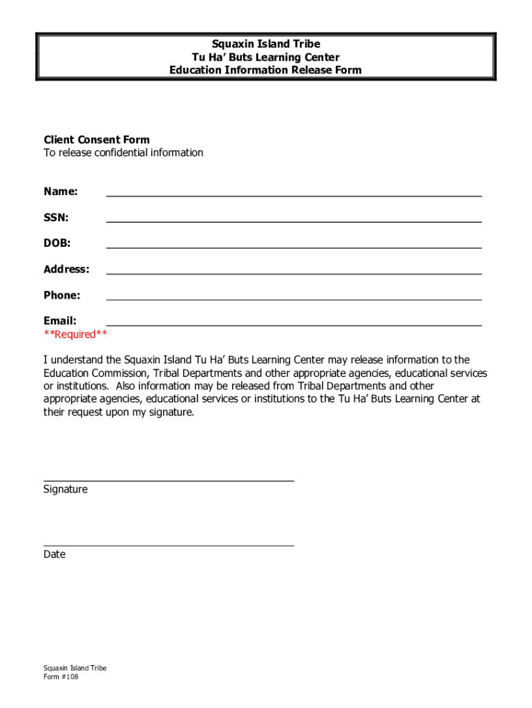 Squalid Island Tribe Tu Ha Buts Learning Center Education Information Release Formulaic Consent Form To release confidential information Name: SSN: DOB: Address: Phone: Email: **Required** I understand