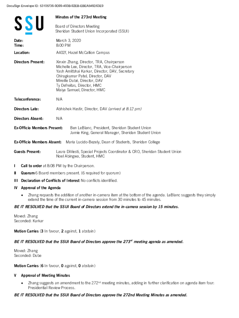 DocuSign Envelope ID: 531057369D99493B92EBEBEA546D63E9Minutes of the 273rd Meeting Board of Directors Meeting Sheridan Student Union Incorporated (SSI) Date: Time:March 3, 2020 8:00 Location:A402f,