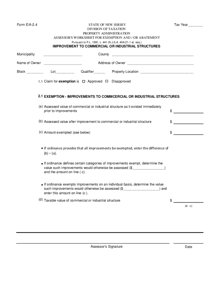 Form E/A2.4Tax Year___STATE OF NEW JERSEY DIVISION OF TAXATION PROPERTY ADMINISTRATION ASSESSOR\'S WORKSHEET FOR EXEMPTION AND / OR ABATEMENT Pursuant to P.L. 1991, c. 441 (N.J.S.A. 40A:211 ET. seq.)IMPROVEMENT