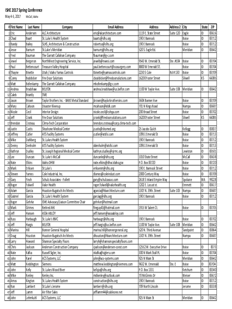 SHE 2017 Spring Conference May 45, 2017 # First Name 1 Eric 2 Chad 3 Randy 4 Jesse 5 Fred 6 Jewel 7 Paul 8 Thane 9 Corey 10 Matt 11 Andrea 12 Caleb 13 Jason 14 Mary 15 Nicole 16 Jeff 17 Brendon 18