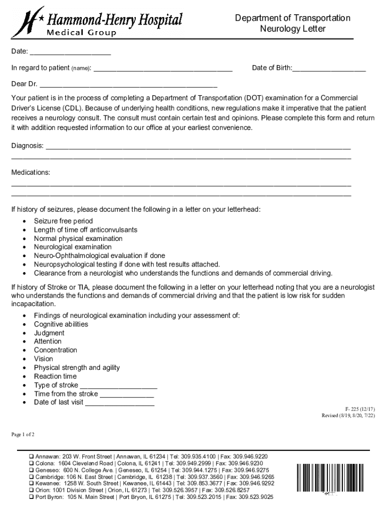 Department of Transportation Neurology Letter Date: ___ In regard to patient (name): ___Date of Birth:___Dear Dr. ___ Your patient is in the process of completing a Department of Transportation (DOT)