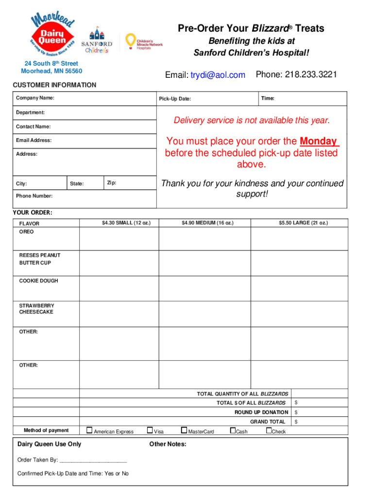 PreOrder Your Blizzard Treats Benefiting the kids at Sanford Children's Hospital! 24 South 8th Street Muirhead, MN 56560Email: trydi@aol.comPhone: 218.233.3221CUSTOMER INFORMATION Company Name:Time:Pickup