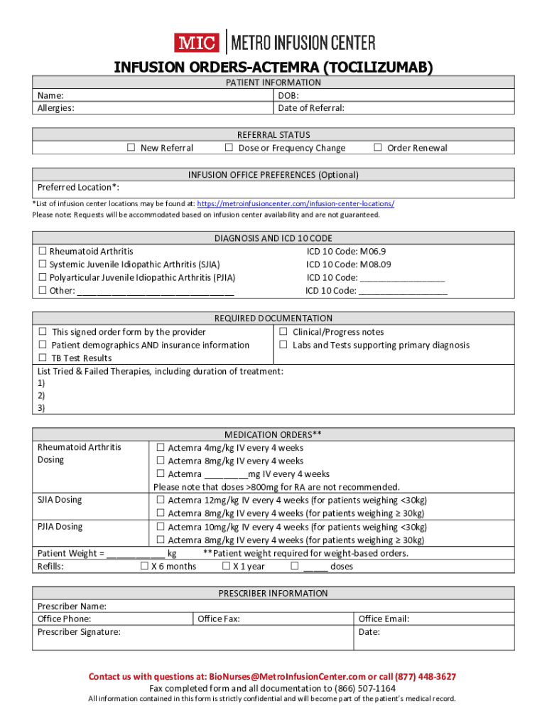 INFUSION ORDERSACTEMRA (OCRELIZUMAB) PATIENT INFORMATION DOB: Date of Referral:Name: Allergies: New ReferralPreferred Location*:REFERRAL STATUS Dose or Frequency Change Order RenewalINFUSION OFFICE