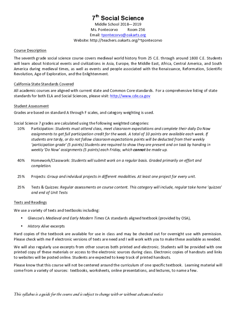 7th Social Science Middle School 20182019Ms. PontecorvoRoom 256Email: tpontecorvo@oakarts.orgWebsite: http://teachers.oakarts.org/tpontecorvoCourse Description seventh grade social science course