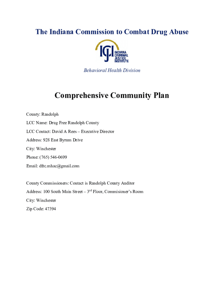 The Indiana Commission to Combat Drug AbuseBehavioral Health DivisionComprehensive Community Plan County: Randolph LCC Name: Drug Free Randolph County LCC Contact: David A Sees Executive Director