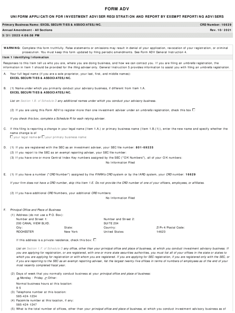 FORM ADV UNIFORM APPLICATION FOR INVESTMENT ADVISER REGISTRATION AND REPORT BY EXEMPT REPORTING ADVISERS Primary Business Name: EXCEL SECURITIES & ASSOCIATES, INC.CRD Number: 16629Annual Amendment