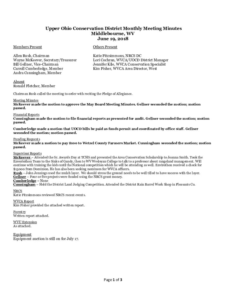 Upper Ohio Conservation District Monthly Meeting Minutes Middlebury, WV June 19, 2018, Members Presenters Present Allen Rush, Chairman Wayne Makeover, Secretary/Treasurer Bill Geller, ViceChairman