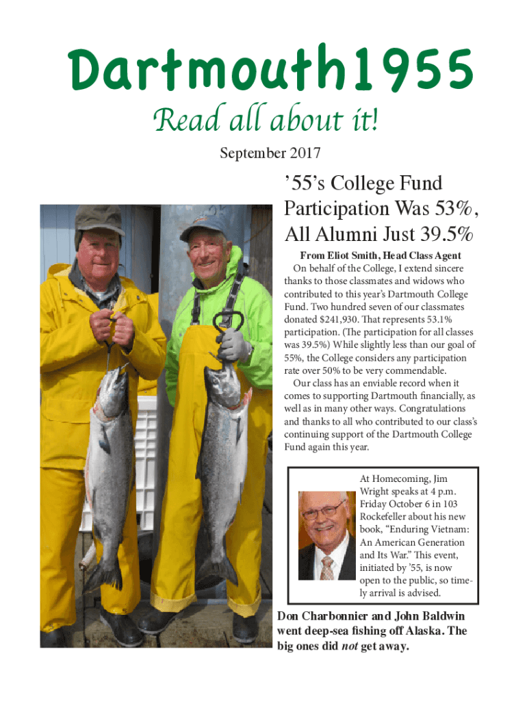 Dartmouth1955 Read all about it! September 201755s College Fund Participation Was 53%, All Alumni Just 39.5% From Eliot Smith, Head Class Agent On behalf of the College, I extend sincere thanks to