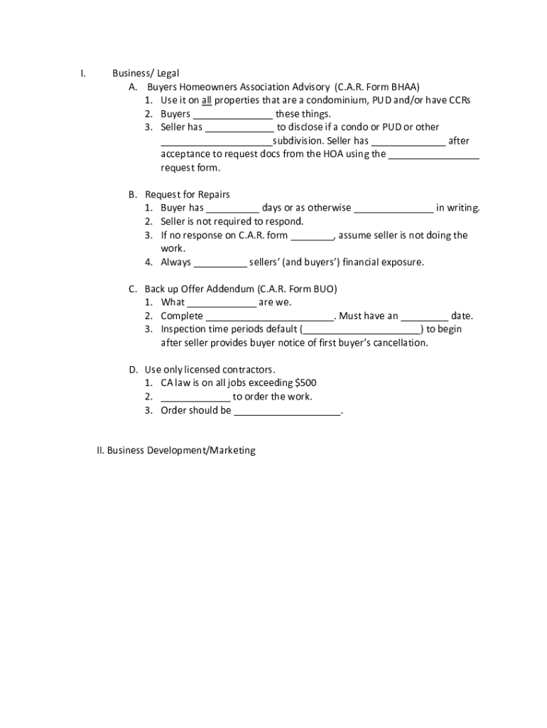 I. Business/ Legal A. Buyers Homeowners Association Advisory (C.A.R. Form BAA) 1. Use it on all properties that are a condominium, PUD and/or have CCR's 2. Buyers ___ these things. 3. Seller has ___