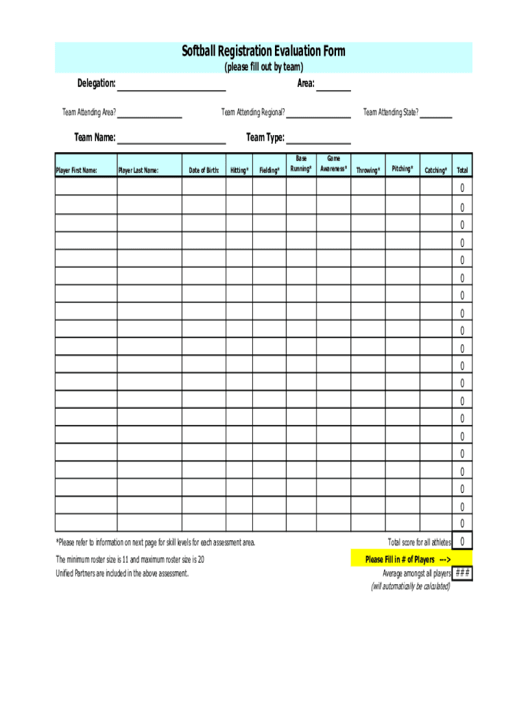 Softball Registration Evaluation Form (please fill out by team) Area:Delegation: Team Attending Area? Team Attending Regional? Team Name:Team Type:Player First Name:Player Last Name:Date of Birth:Hitting×Fielding×Team