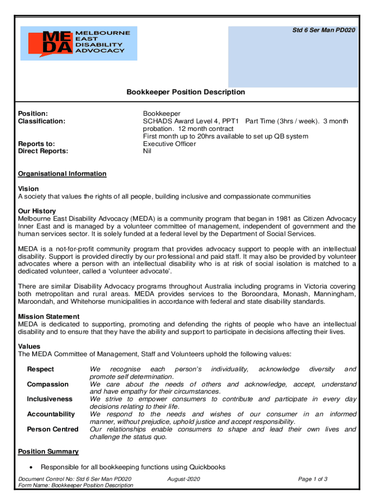 Std 6 SER Man PD020Bookkeeper Position Description Position: Classification:Bookkeeper CHADS Award Level 4, PPT1 Part Time (3hrs / week). 3 month probation. 12-month contract First month up to 20hrs