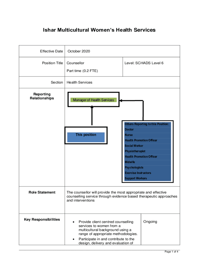 Ishtar Multicultural Women's Health ServicesEffective Date October 2020Position Title CounsellorLevel: CHADS Level 6Part time (0.2 FTE) Section Health Services Reporting RelationshipsManager of Health