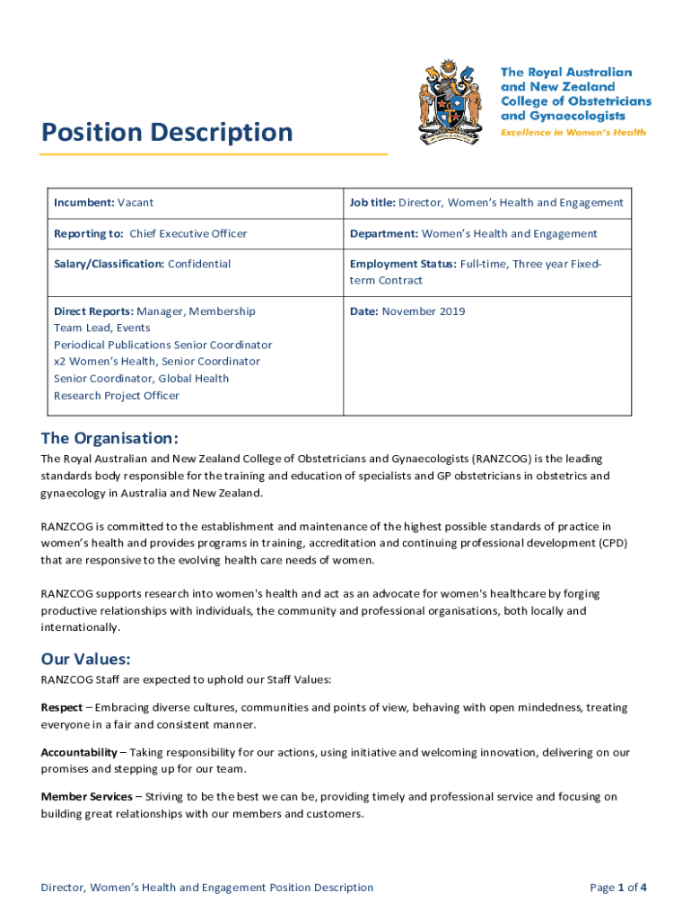 Incumbent: Vacant Job title: Director, Women's Health and EngagementReporting to: Chief Executive OfficerDepartment: Women's Health and EngagementSalary/Classification: ConfidentialEmployment